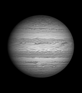 | Equipment: | Player One Uranus-M, Optalong 685 nm long pass filter, Orion Optics 450 mm f/15 Dall-Kirkham, Mesu E200 Mk 2 Mount | | Location: | urban Berkshire | | Observer: | Peter Tickner | | Target name: | Jupiter in IR |