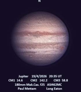 | Equipment: | 180mm Maksutov-Cassegrain f15. ASI 462MC | | Exposure: | Live Stacking 1000 frames in Sharpcap | | Location: | Long Eaton | | Observer: | Paul Mettam | | Target name: | JUPITER |