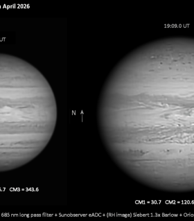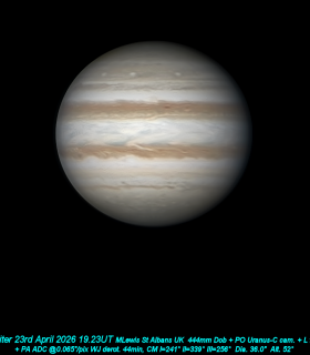 | Equipment: | Player One Uranus-M, Optalong 685 nm long pass filter, Chroma RGB filters, Sunobserver eADC, Altair 8 position filter wheel, Orion Optics 450 mm f/15 Dall-Kirkham (at 440 mm), Mesu E200 Mk 2 Mount | | Location: | urban Berkshire | | Observer: | Peter Tickner | | Target name: | Jupiter IR and RGB 21st April |