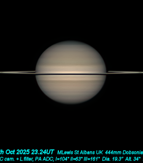 | Equipment: | 444mm Dobsonian, Player One Uranus C camera with L filter | | Location: | St Albans, UK | | Observer: | Martin Lewis | | Target name: | Saturn |