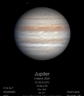 | Equipment: | C14 XLT, AP1200, ASI462MC, Astronomic Pro Planet IR642, Astronomic Type 2 L, ADC | | Exposure: | 13000 at 13ms | | Location: | Norfolk | | Observer: | Geof Lewis | | Target name: | Jupiter |