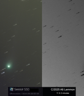 | Equipment: | ZWO Seestar S30 | | Exposure: | x313 30 sec exposures | | Location: | Banbury | | Observer: | Steve Knight | | Target name: | C/2025 A6 (Lemmon) |