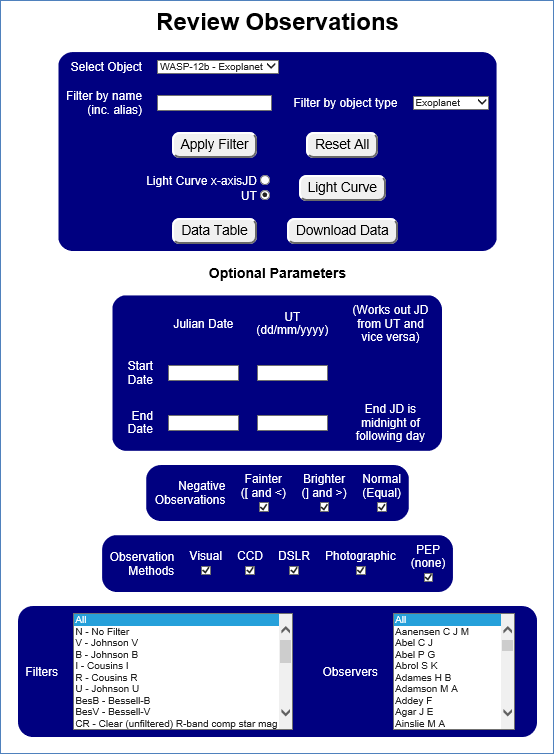 · You can limit the list by selecting an Object Type of Variable Star, Exoplanet or Asteroid and pressing “Apply Filter”.