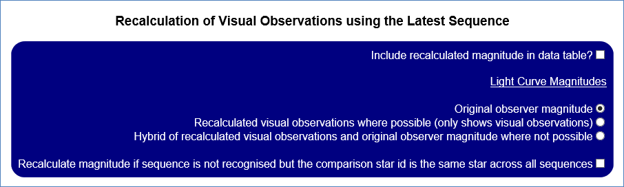 It should be noted that recalculation is only enabled for visual observations. It is not enabled for digital observations made by CCDs and DSLRs as there are other complications which could result in a lower quality derived magnitude.