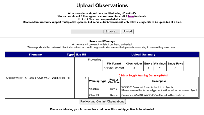 5. As long as there are no errors then a “Review and Commit Observations” button will appear at the bottom of the web page. Unless you are going to upload more files you should now click this button.