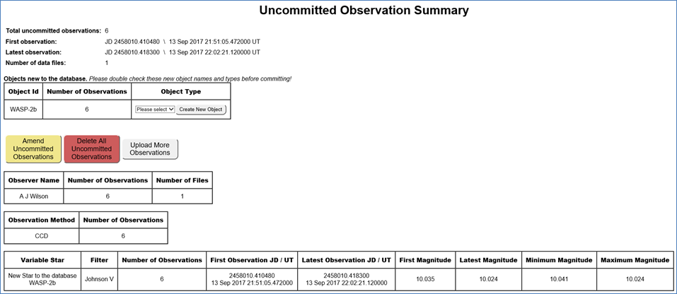 7. If there are any objects in your file that are not already in the database then a list of them will appear near the top of the webpage. You will need to create these objects using the drop down list and buttons before you are able to proceed to commit the observations to the database.