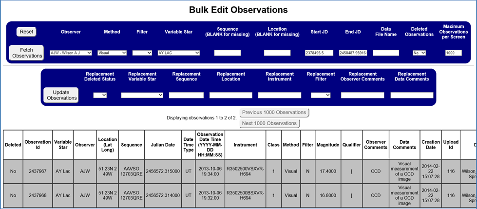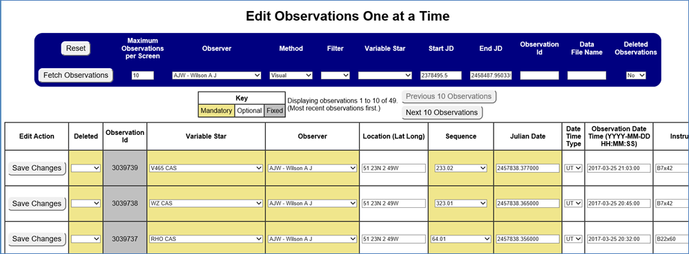 Note that although this screen can show you multiple observations, only 1 observation may be edited at a time. For large scale changes the “Bulk Edit Live Observations” screen should be used, or contact the BAA Photometry Database Manager using the address at the bottom of the homepage.