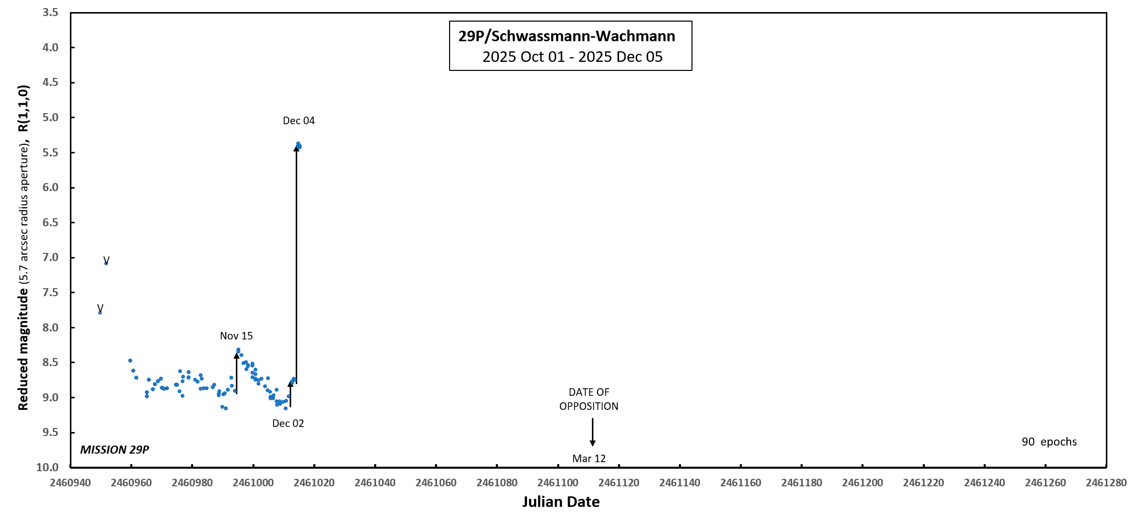 This is the latest lightcurve for 29P. It is usually updated once per week (Saturdays). If a strong outburst happens, it will be updated more frequently.
