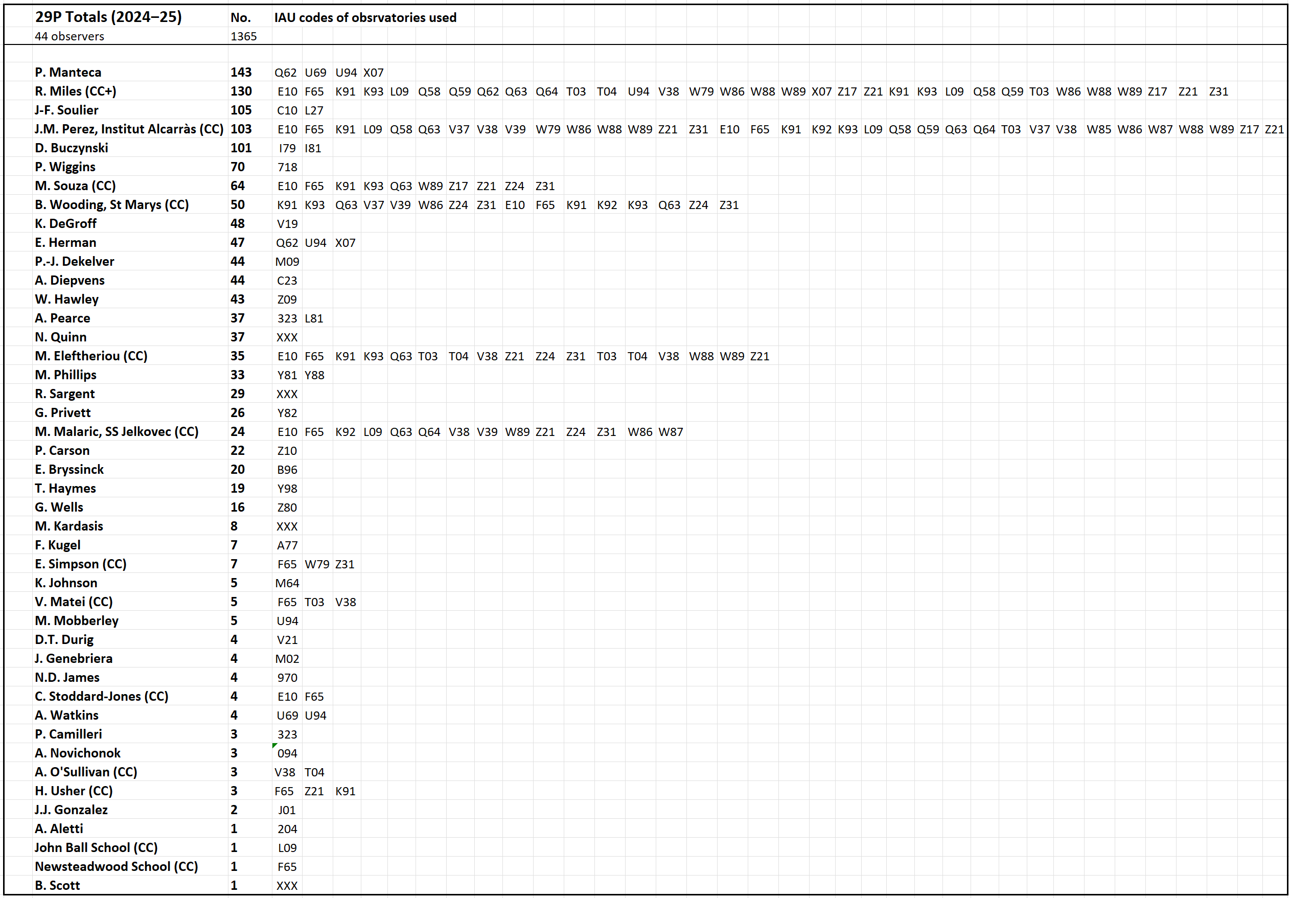 Coverage of the latest apparition was completed with the last observations on 2025 July 24.70. The last outburst was detected on 2025 Jul 04.46±0.40 – a very weak event having an intensity of 0.9 nucleus-equivalents. Thanks to our dedicated observers, we have amassed photometry on 1364 epochs, which is our best total to date. A link to the textfile of the observations is included near the foot of this page, or click HERE. The total number of epochs each person observed, along with the various observatories each used, are listed below. Congratulations and thanks go to all the observers, all 44. Pepe Manteca leads the totals, which is especially commendable given that Pepe used iTelescope for all of his imaging. MISSION 29P is particularly grateful to the Las Cumbres Observatory, The Schools’ Observatory and the 12 Comet Chasers (Faulkes Telescope Project), who scheduled and successfully imaged 29P.