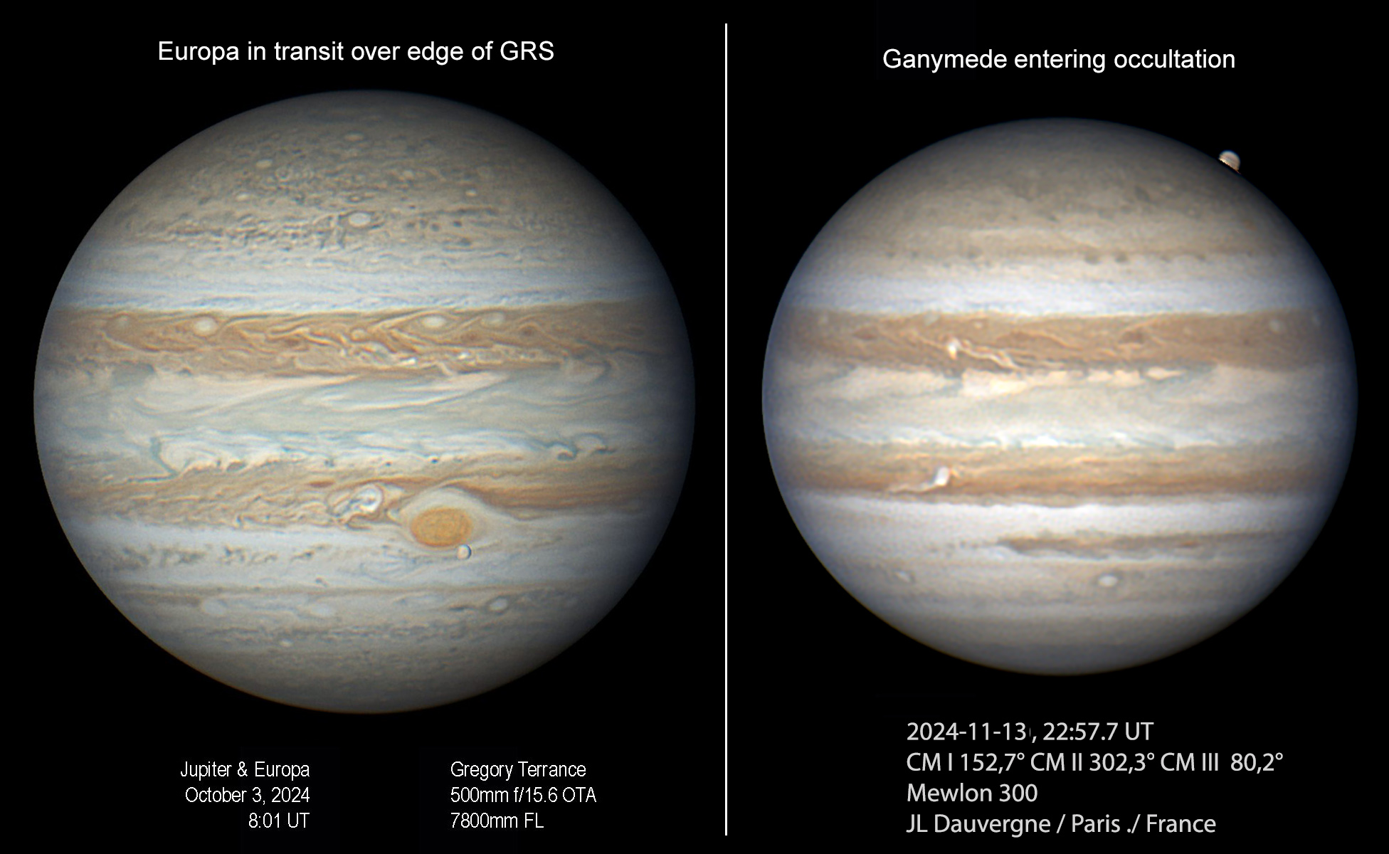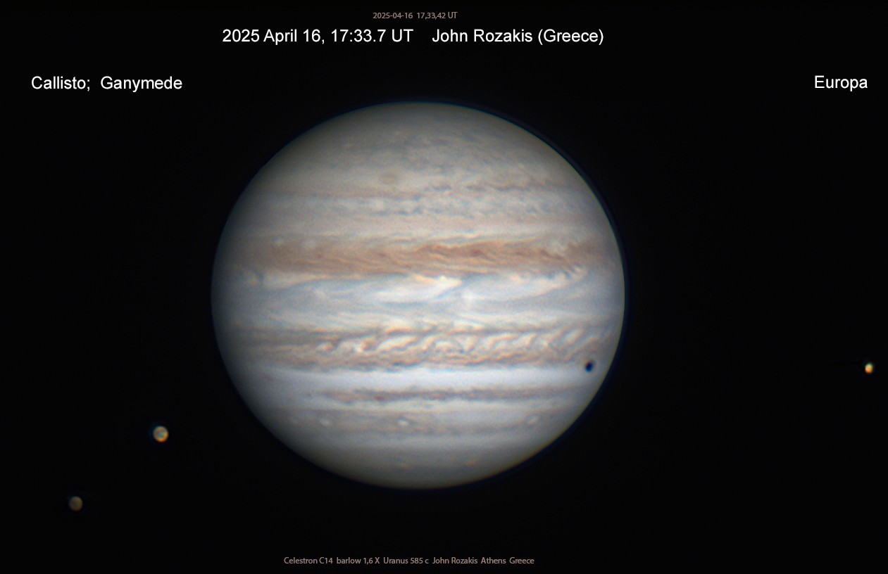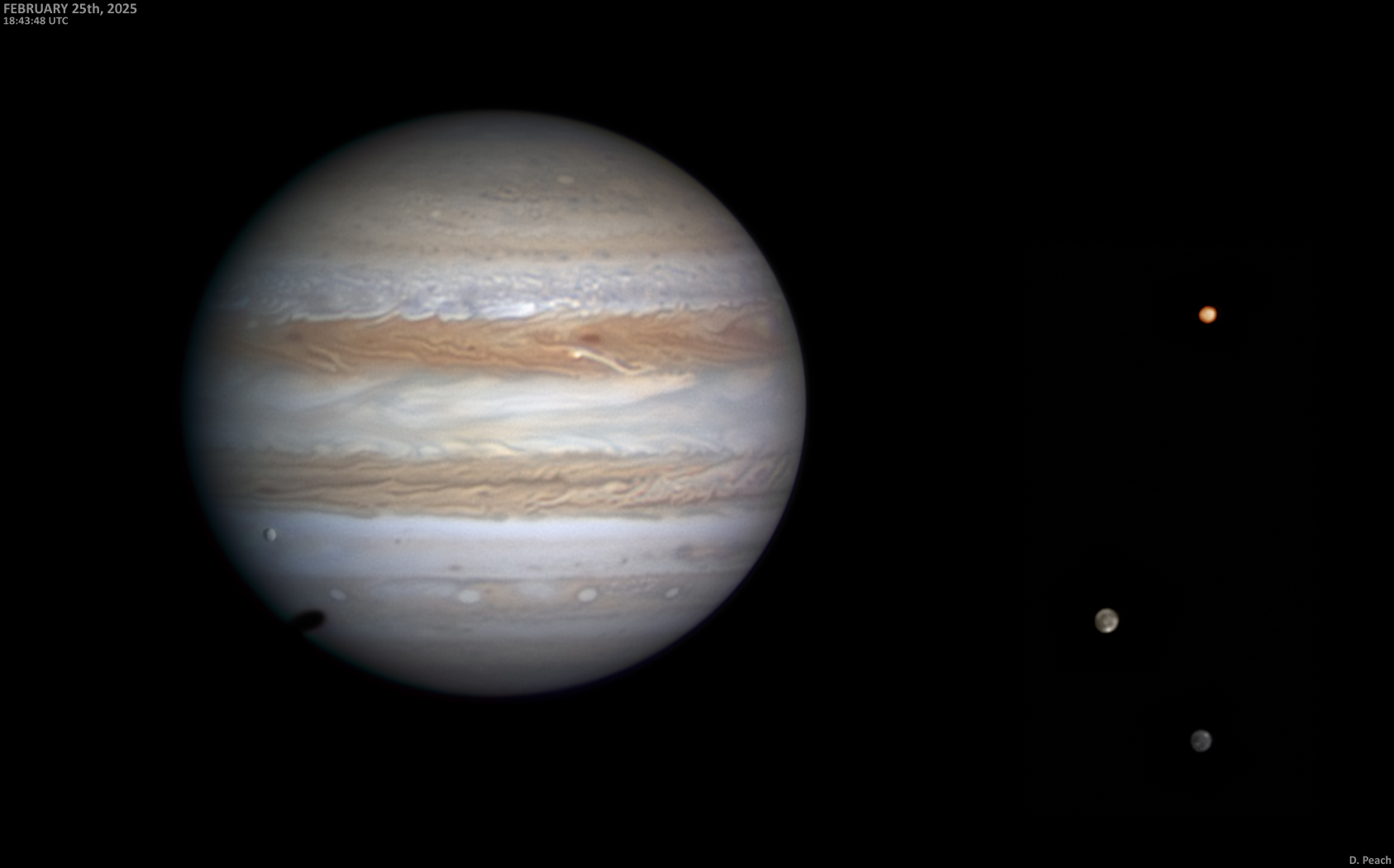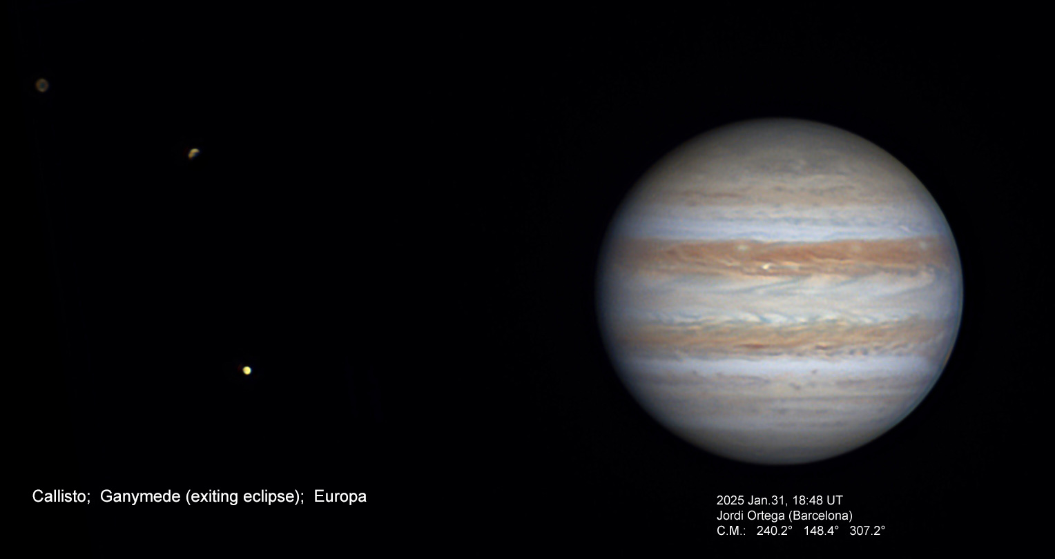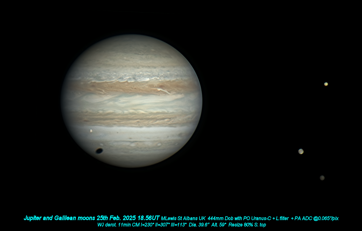 ii)  Views of impressive satellite groupings, including the clustering of all four Galilean moons around the planet on 2025 Feb.25.  The animation of that event is by Mike Foulkes, showing Ganymede shadow transit, Europa transit, and Io occultation — a neat illustration of the coupled orbits of these three moons.