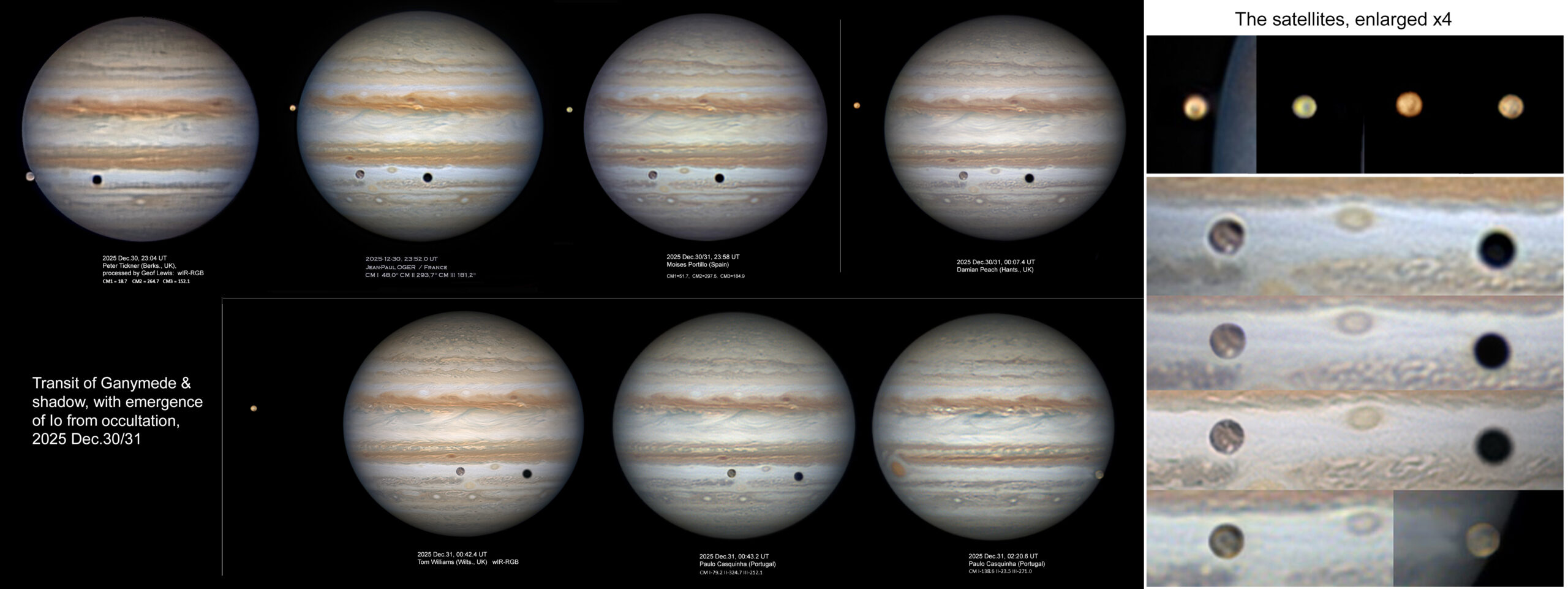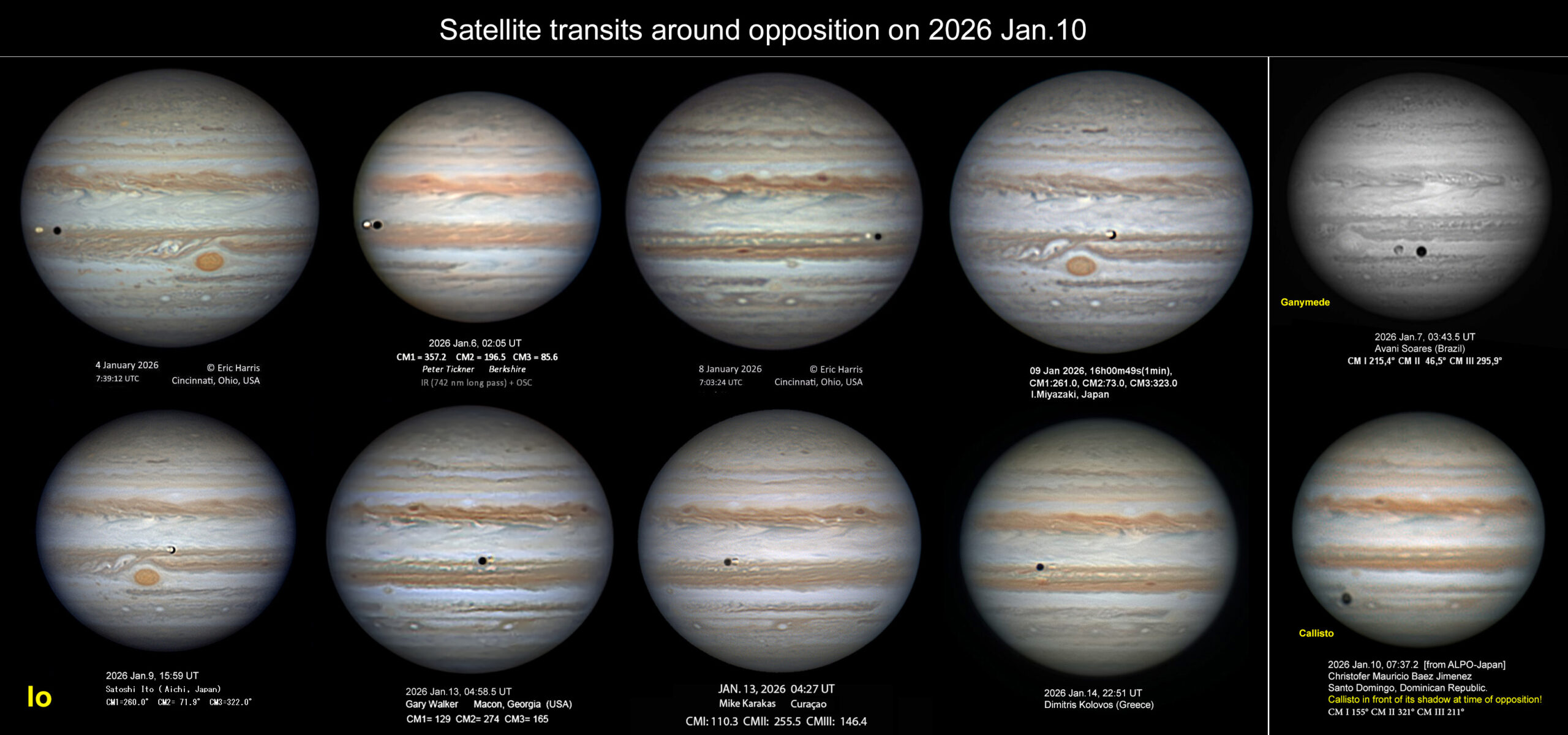 {3} Satellite transits beside or in front of their shadows around opposition on 2026 Jan.10. All are of Io, except for Ganymede (Jan.7) and Callisto (Jan.10, actually at the time of opposition). This view by Christofer Mauricio Baez Jimenez in the Dominican Republic is the only known resolved image of this rare event.