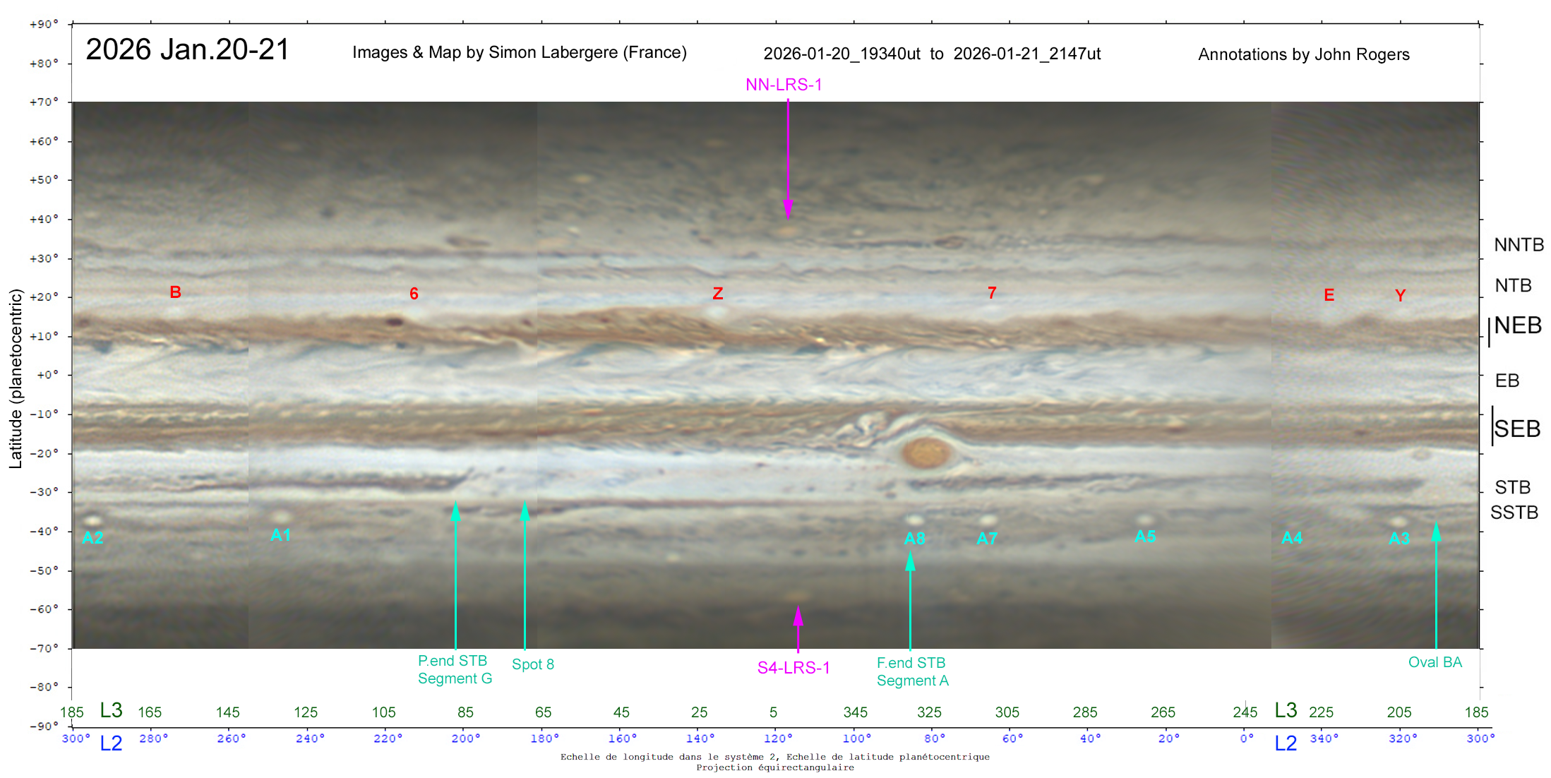 {5} Map on Jan.20-21, made by Simon Labergere (France) from his own images over just two nights at the Mont d’Arbois Observatory. (Note that the scales of longitude (L2 and L3) and latitude (planetocentric) differ from our usual conventions.)