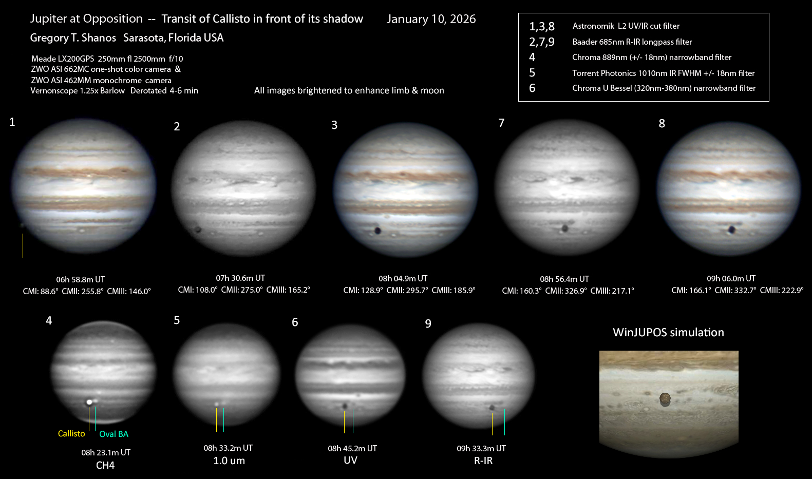 {3} Satellite transits beside or in front of their shadows around opposition on 2026 Jan.10. All are of Io, except for Ganymede (Jan.7) and Callisto (Jan.10, actually at the time of opposition). This view by Christofer Mauricio Baez Jimenez in the Dominican Republic is the only known resolved image of this rare event. Addendum: Gregory Shanos in Florida has also sent a series of images of the event, with different filters, posted below. Callisto is in front of its shadow but centred slightly further north; Oval BA is adjacent.