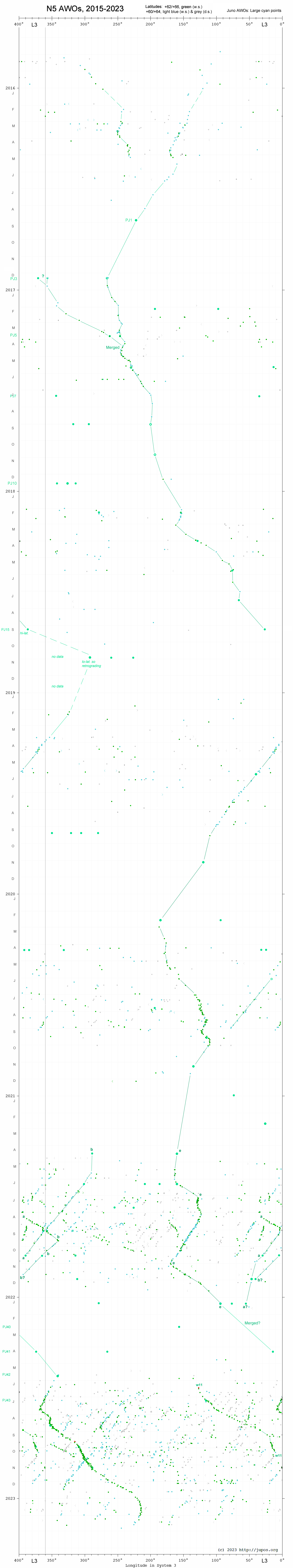 Here we present the JUPOS chart from 2015 to 2023 from latitudes 60-66ºNg (planetographic) [= 57-63ºNc (planetocentric)], in order to display the largest N5 AWO(s) which are always found in this range, and to exclude other white spots further south in the domain which would confuse the AWO tracks. This range does not extend down to the N5 jet (mean latitude 55.8ºNg [52.2ºNc]), but it includes the N6 jet (mean latitude 63.8ºNg [60.7ºNc]), as the largest N5 AWO is often seen straddling this latitude in JunoCam images; apparently it diverts the jet around it. Small points are JUPOS measurements from amateur images, and may include some cyclonic spots as well as AWOs. Large points (larger for the largest oval) represent AWOs on JunoCam maps.