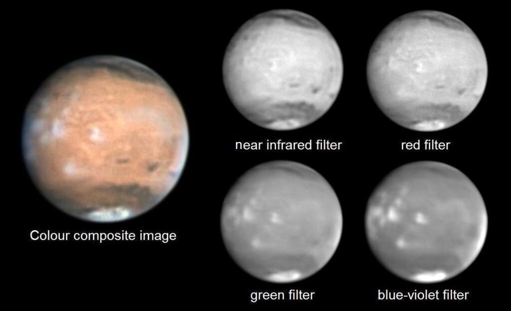 The systematic use of colour filters (whether for visual or imaging work) is very important, not least from a diagnostic viewpoint. White clouds will appear brighter in blue light than in red light, but contrarily dust clouds will be brighter in red, somewhat less bright in green, and invisible in blue. Filters therefore enable discrimination between white clouds and atmospheric dust. Any red, orange or yellow filter will also helpfully increase the contrast of the albedo markings. Nowadays most filters are of glass, and can conveniently be screwed into the barrel of an eyepiece, but a strip of photographic gelatine will also serve.