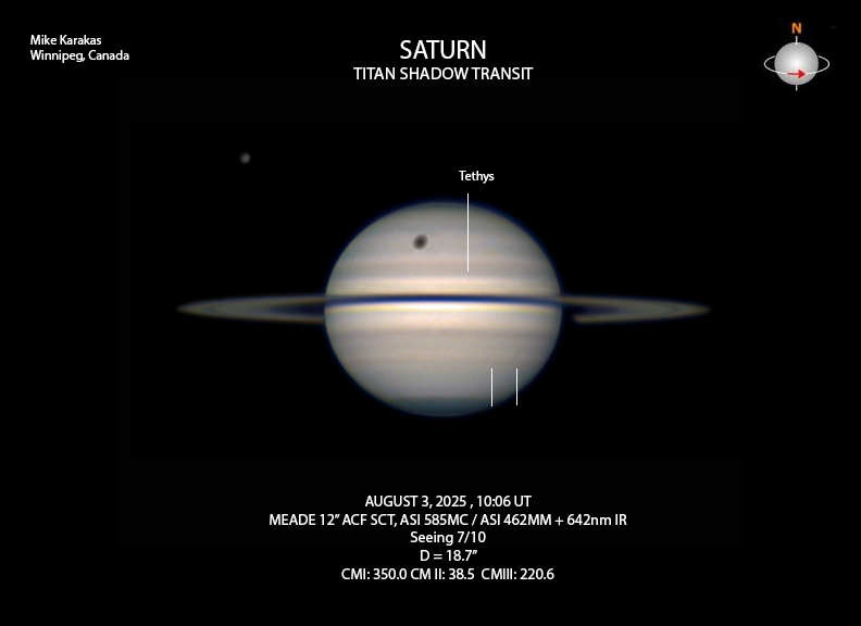 Gregory was able to continue his series of observing Titan’s shadow in transit on August 3, from 07:27 UT until 10:21 UT. This event was also observed by Mike K with Tethys also in transit.