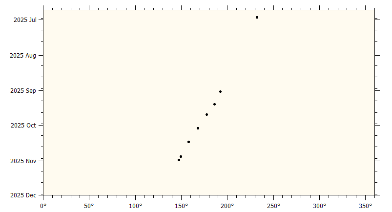 Trevor was able to detect the AV, but so far, he is the only observer who has been able to do this. Even with his high resolution images, the AV has appeared very small and very difficult to detect. The drift chart in System III for the AV up to the end of October is shown below. The drift is ~ -0.7 deg/day.