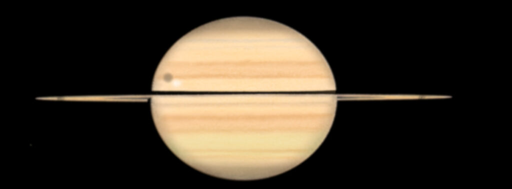 2025 September 04. 06:26 UT. Efrain Morales. 305mm SCT. Shows Titan’s shadow in transit plus Titan Nf. and Tethys N f of the rings.