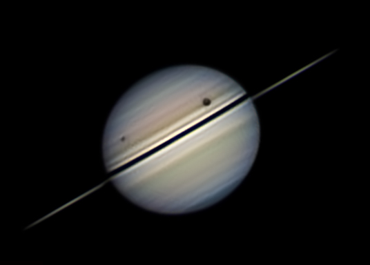 On May 3 at 19:44 UT, Andy Casely imaged the planet and a faint object was detected p. the rings. The position of this object was a very good match (within one pixel) to the predicted position of satellite Epimetheus derived using the NASA Horizons and Planetary Data System. Similarly, on May 9 at 19:52 UT, Andy imaged a faint object f. the rings close to Enceladus. The position of this object was a very close match to satellite Janus, again the NASA Horizons and Planetary Data System.