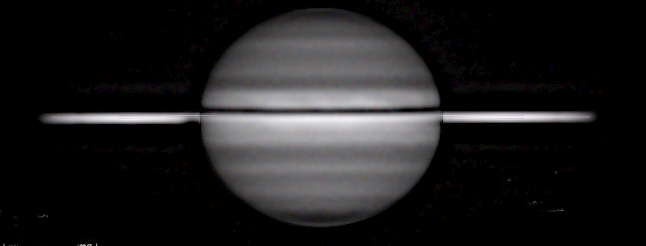 2025 April 12. 19:41 UT. Andy Casely. C14 IR>642nm. The unilluminated north face of the rings are faintly visible in the enhanced image (upper image).