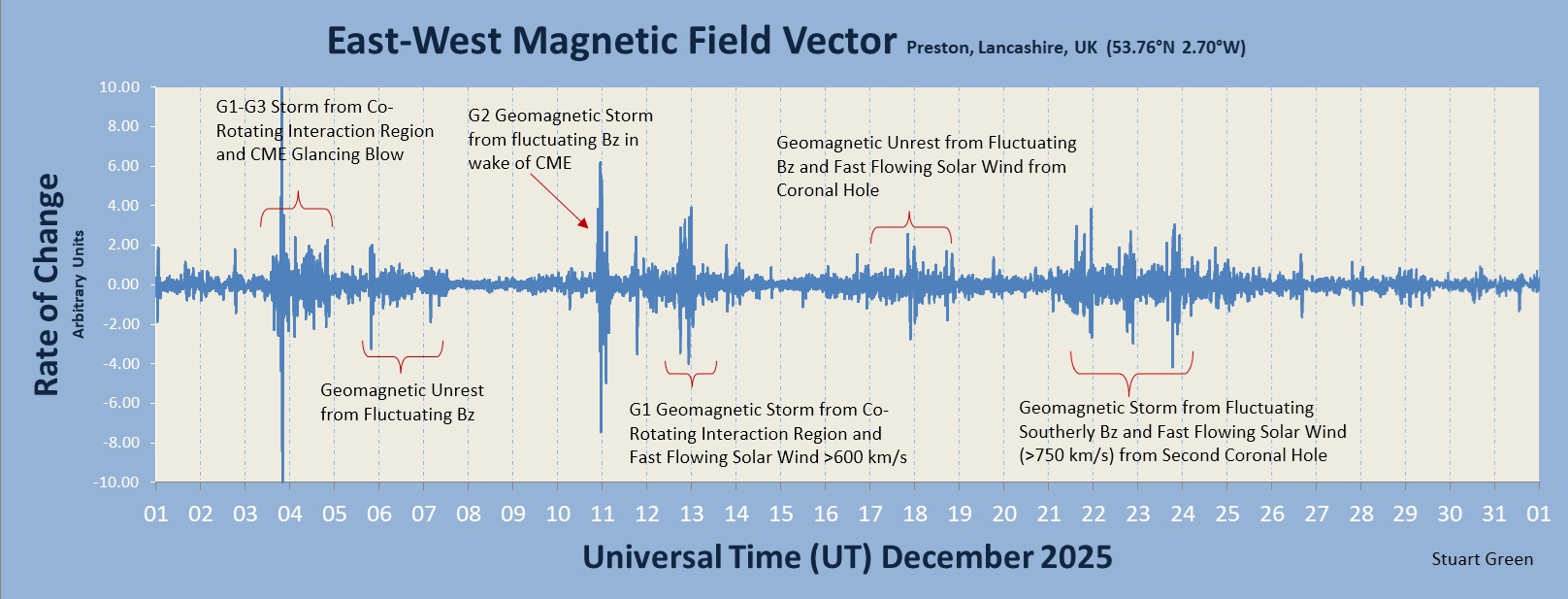 The plots below shows the magnetic field strength variations as recorded by Stuart Green in Preston, Lancashire, UK. Stuart explains how the measurements are made: ‘My magnetometer is based on an FGM3 fluxgate sensor buried in my garden in protective packaging, pointing in an east-west orientation to measure the local magnetic field variations in this direction. This is to minimise temperature fluctuations as the sensor is highly sensitive to changes in its thermal environment. The output is a train of pulses, the frequency of which is dependent on the strength of the local magnetic field. These are ultrasonic and need down converting using an electronic circuit to within the operating frequency range of my computer’s sound card. The signal is recorded using Spectrum Lab free software and sampled every 2.5 minutes to my hard drive. This system is highly sensitive and provides a detailed record of my local geomagnetic environment as it changes as a result of space weather 24/7’. Further details can be found here.