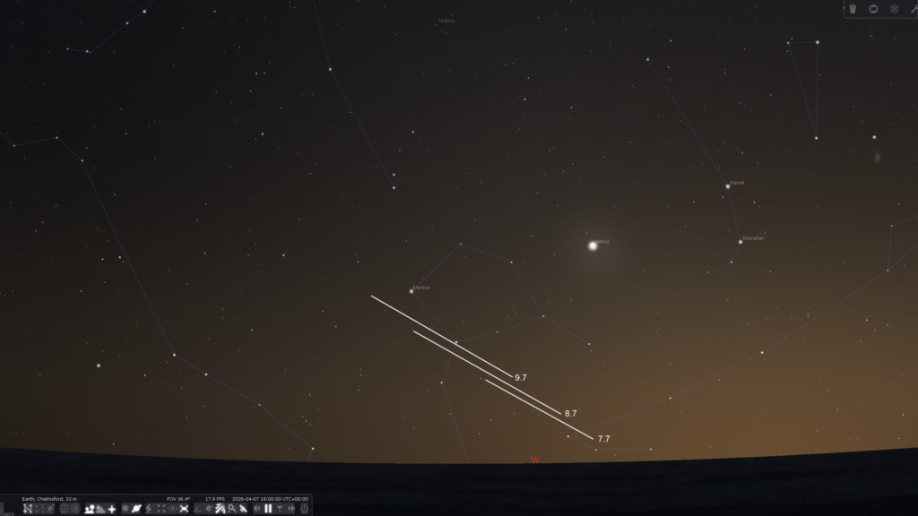 At the moment we don’t really know what C/2026 A1 will do. Early indications are that it is brightening rapidly and that it is a reasonably large fragment. It is currently around 13th magnitude but it is very difficult to predict how bright it will become. In any case it will be very close to the Sun at its brightest. It you can access the comet at its current southern declination it would be valuable to make total magnitude estimates and submit these to COBS. Nicolas Lefaudeux has produced a very useful comparison of this comet with other Kreutz members here and the post-perihelion evening sky charts here are based on his tail simulations. Unfortunately, even if the comet does perform it will be a challenging target from UK latitudes. Much better views will be had the further south you can get. Potentially, though, we might have a display similar to C/2011 W3 (Lovejoy) in 2011.