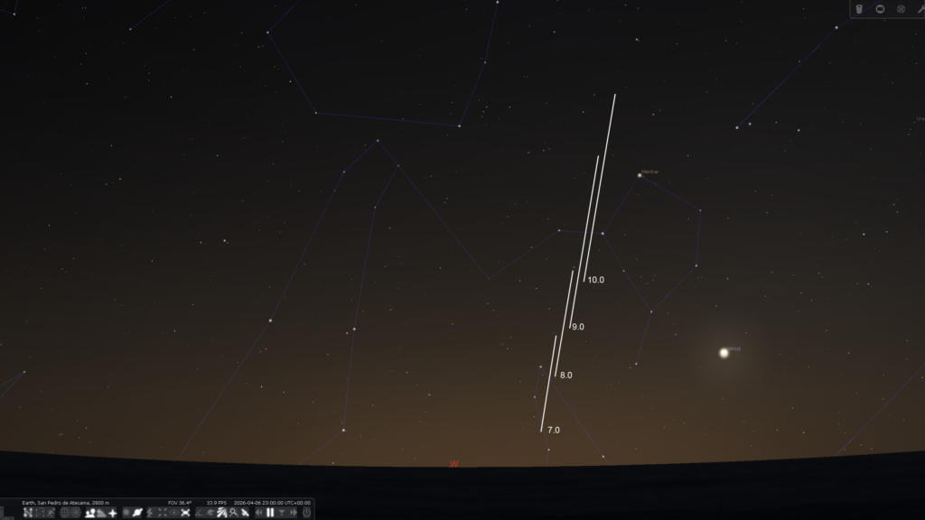Post perihelion tail orientation in the evening sky April 7,8,9 and 10 from 22S. 30 minutes after sunset.