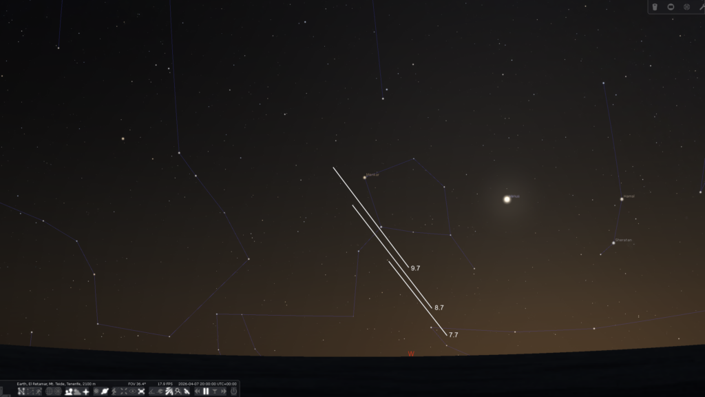 Post perihelion tail orientation in the evening sky April 7,8 and 9 from 52N. 20 minutes after sunset.