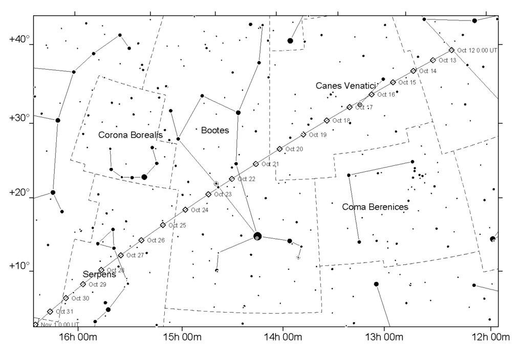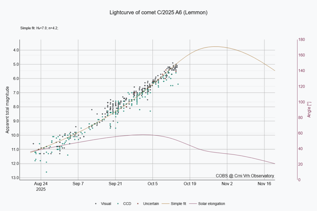 The easiest comet to see will be C/2025 A6 as it moves through Canes Venatici into Bootes and then Serpens through the rest of October. New moon is on October 21 so, if the weather cooperates, we should have the opportunity to see it reasonably high up in a dark sky. Wide-angle images show that that the ion tail is already multiple degrees long and narrow-angle images show a lot of detail in the coma and inner tail. The BAA image archive for C/2025 A6 is here.