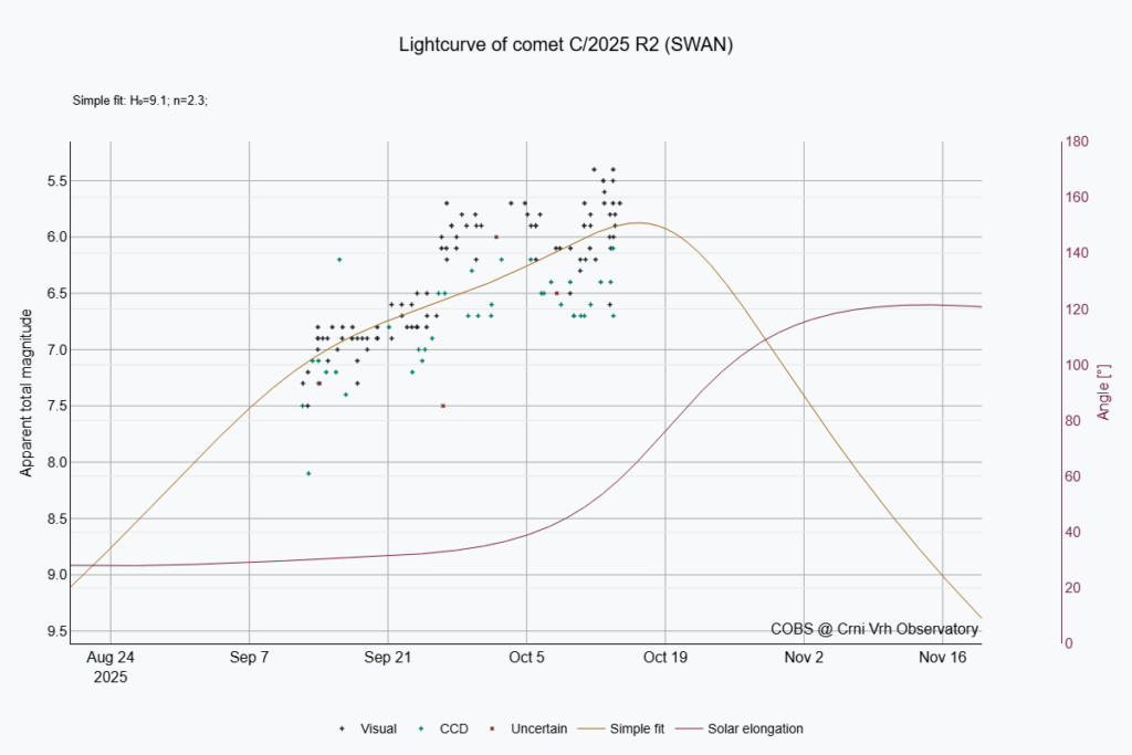 Good luck with observing both of these comets. Finder charts for both comets are below and here as PDFs for C/2025 A6 and C/2025 R2. Details of how to observe comets are included in the section Observing Guide. Let’s hope that the weather cooperates.