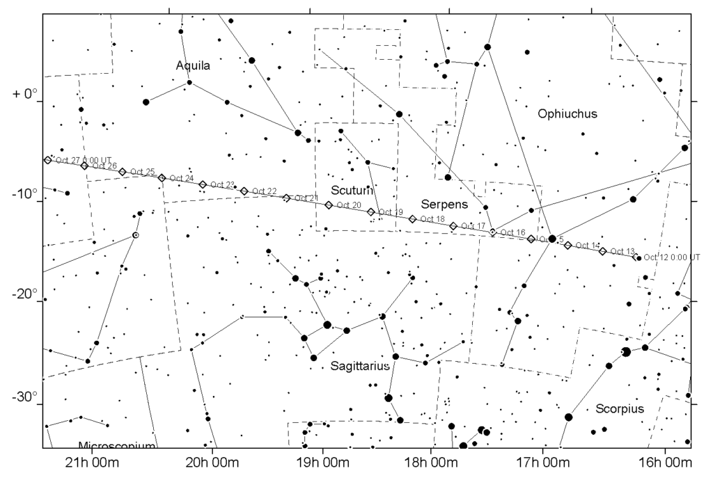 Comet C/2025 R2 will be more of a challenge. It remains a southern hemisphere object but it is rising higher in the SW evening sky. Through October it moves from Ophiuchus into southern Aquila. It is currently around 6th magnitude and it will fade to around mag 7 by the end of October. The BAA image archive for C/2025 R2 is here.