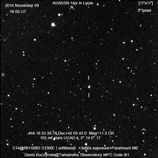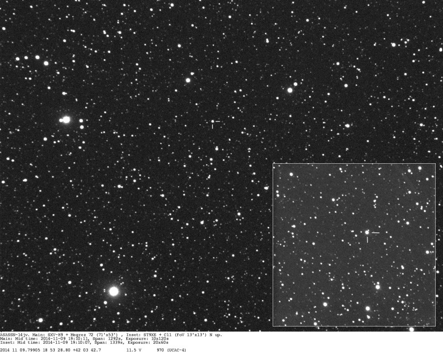 Object RA (J2000) DEC (J2000) Disc. UT Date Disc. V mag ASASSN-14jv 18:53:28.87 +42:03:43.59 2014 Nov 9.19 11.3ASASSN-14jv was present in two images obtained on 2014 Nov 9 but undetected (V>15.7) on 2014-11-07.2 and earlier. There is a nearby blue source in the Kepler Input Catalog (18:53:28.814, +42:03:43.57), with g=19.1, r=19.4, and i=19.6, 0.6" away from our nominal position in the discovery image (ASAS-SN image scale is 7.5"/pixel). Additionally, there is also a GALEX source 0.021' away from our nominal position. ASASSN-14jv is most likely a large-amplitude CV outburst, caught very early.